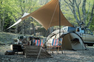 展示する車がアウトドア向けな感じだそうで、それに合うキャンプ道具を飾って欲しいとのこと。