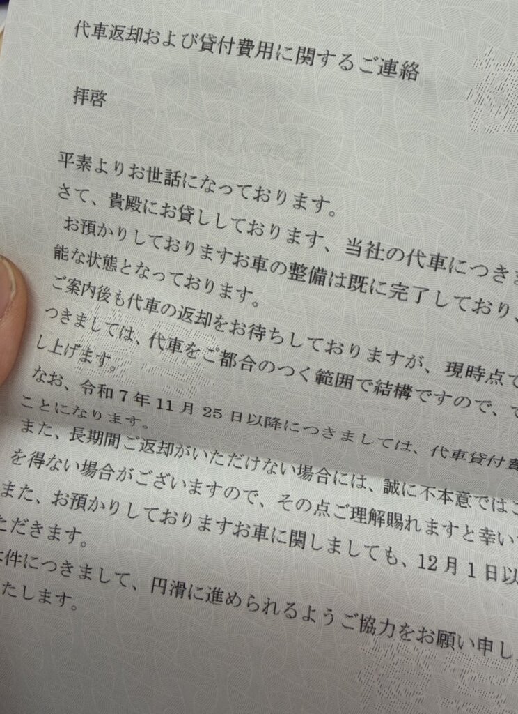 何文字以内とか、色々縛りがあるので、チャットGPTに丸投げして、代車を返してほしい旨と、早めにお支払いお願いしますっていう、いい感じの文章を書いてもらいました。