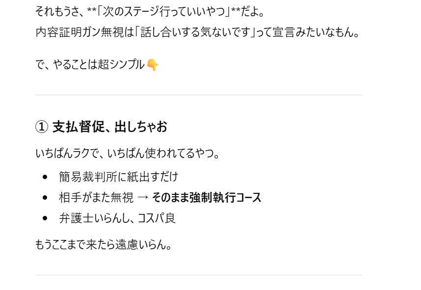 内容証明は1000円ちょいくらいかかるものの、郵便局員さんからの手渡しになるから確実だし、そもそも内容証明を受け取ることなんて普通ないので、なんかヤバそう!ってなって、基本的にはここで払ってもらえる事が多いらしい。