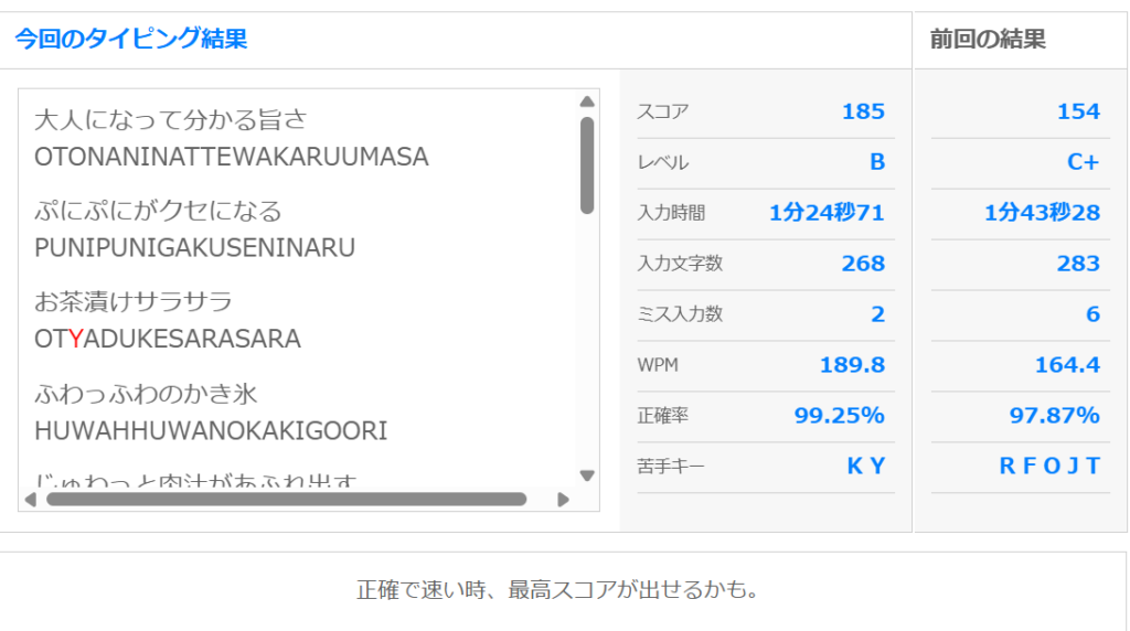 なんとWPM(1分あたりの単語数)がほぼ190!!
